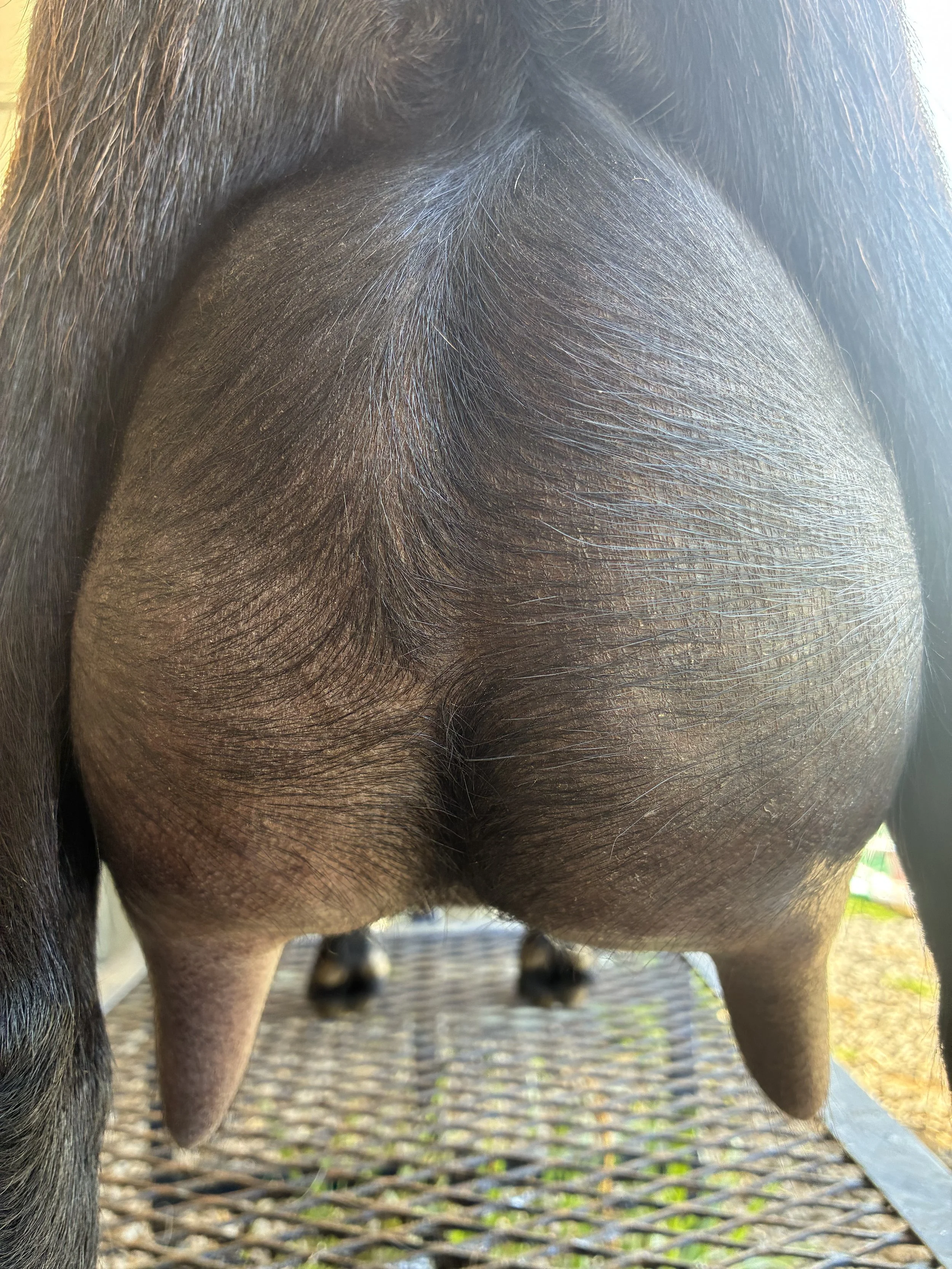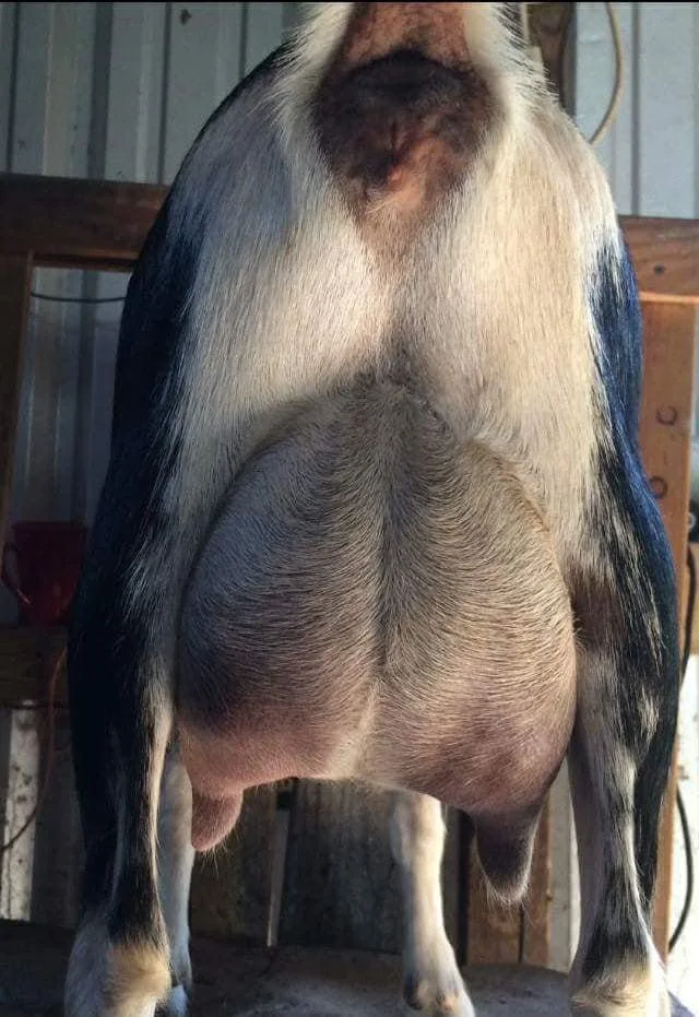 CH Dawnland RR Little Bee- 1st Place Aged Doe at 2024 ADGA National Show (granddam, left) & CH Dawnland BF Zenyatta (dam, right)